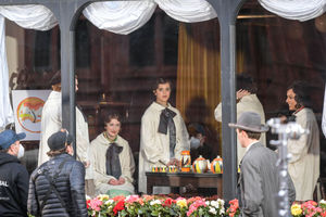 Extras dressed in period clothing walked the streets outside opposite Birmingham's Magistrates Court.