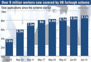 Nationally, the ONS said early estimates showed the number of paid employees dropped by 2.1 per cent or 612,000 in May compared with March. The number of people temporarily away from work, including furloughed workers, rose by six million at the end of March into April.