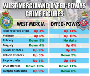 In the Dyfed-Powys region, there were 25,742 crimes reported compared to 23,268 reported in the year up to March 2017.