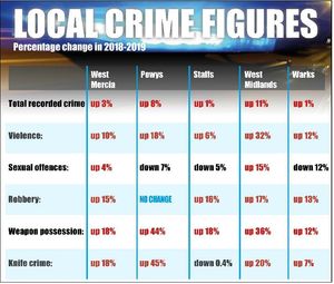 Overall crime went up three per cent in the West Mercia Police force area, with a 10 per cent rise in crimes of violence against a person; stalking and harassment crimes had increased 33 per cent and robbery by 15 per cent.