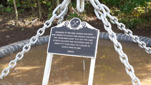 A plaque on the sculpture reads: "Dedicated to the men, women and boys who worked at Alveley and Highley collieries. This 'detaching hook' is of the type used at both collieries and positioned here to mark fifty years since the closure of Alveley mine in 1969. MMXIX."