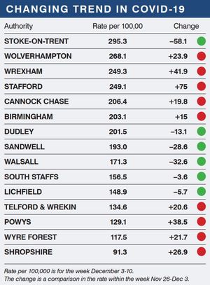 In Telford & Wrekin the rate has risen by 17 percent from 113 to 132 between 4 and 11 December. The rate in Powys is also 130.