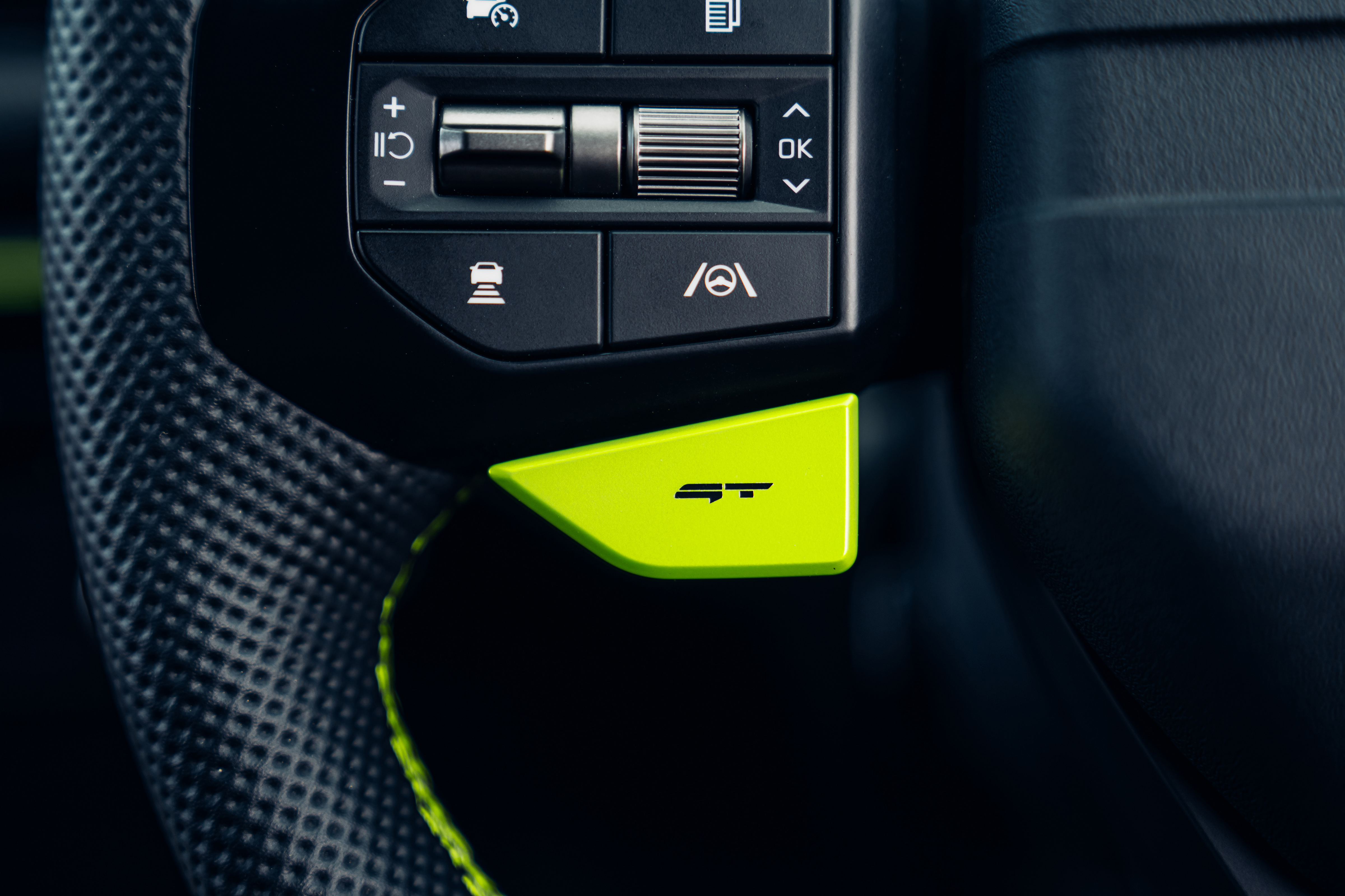 The lime green theme continues from the brake calipers into the cabin, which is found on the stitching, steering wheel centre marker and detailing on the seats.