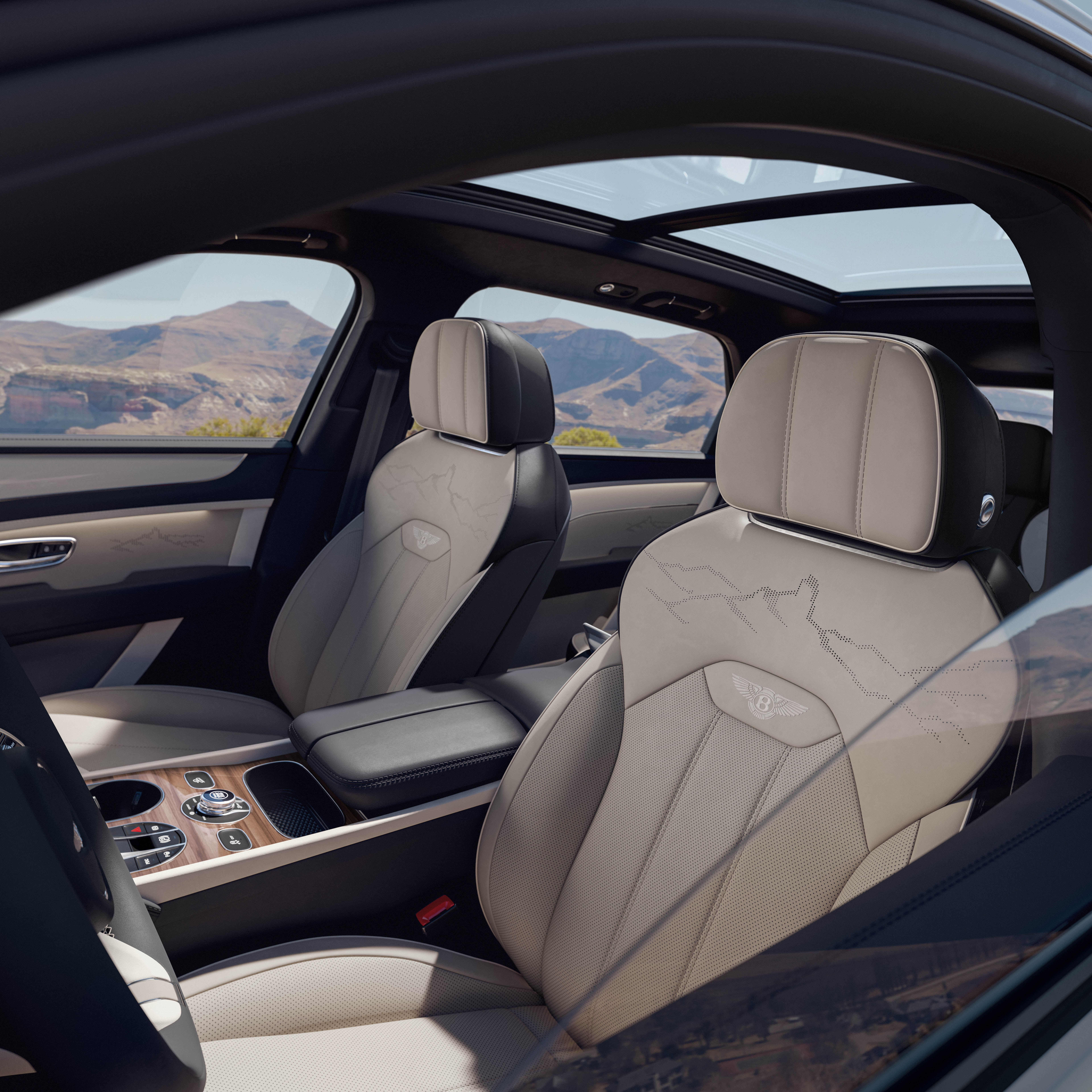 The interior features Roque Bentayga mountain motifs. (Bentley)